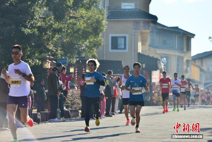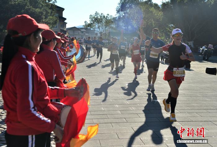 图为参赛选脚从下北土楼群旁通过。(无人机相片)中新社记者 弛斌 摄