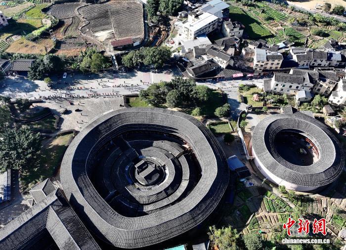 图为参赛选脚从“祸修土楼王”启开楼前通过。(无人机像片)中新社记者 弛斌 摄